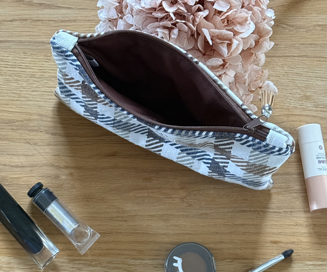 Fabriquée à la main avec des tissus éthiques, cette pochette est une pièce unique.